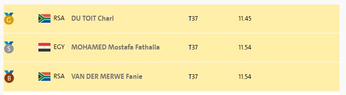 وجاء مصطفى فتح الله في المركز الثاني، بعدما قطع المسافة في زمن قدره 11.54 دقيقة، بفارق ضئيل عن العداء الجنوب أفريقي «كارلو دو تويت»، الذي جاء بالمركز الأولى، بعد قطعه المسافة بزمن قدره 11.45 دقيقة. وتًعد أول ميدالية لمصر خارج ألعاب الوزن الثقيل.