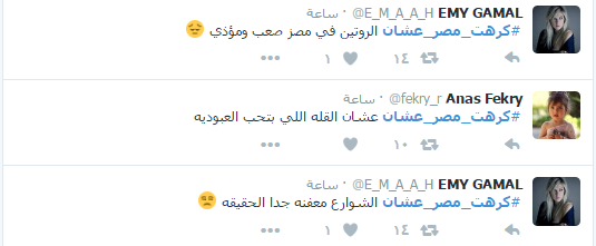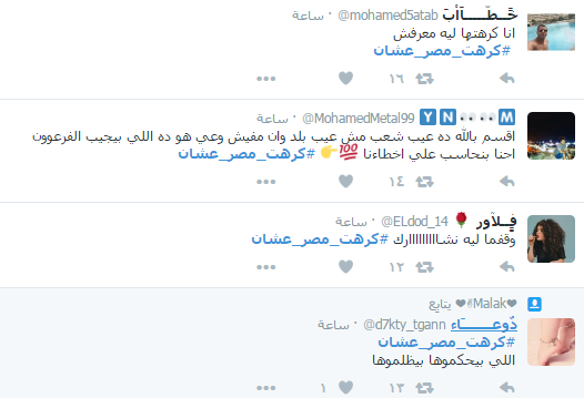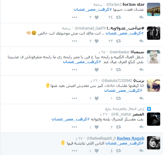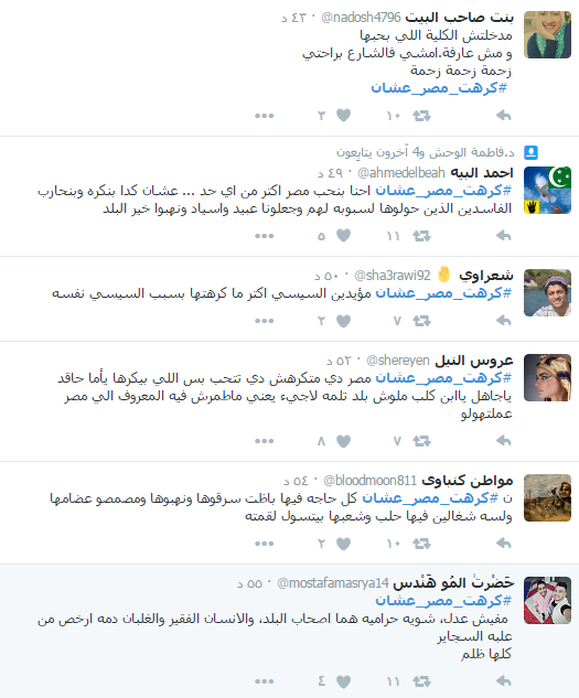 بينما عبر آخرون عن كرههم البلد نتيجة ظلم حكامها وغياب العدل فيها واضطهاد الإنسان الفقير، وأعلنها أخرون صراحة عندما قالوا: إنهم كرهوا مصر لوجود السيسي، ولأنها أصبحت معسكر كبير له ولأعوانه من الجنرالات .
