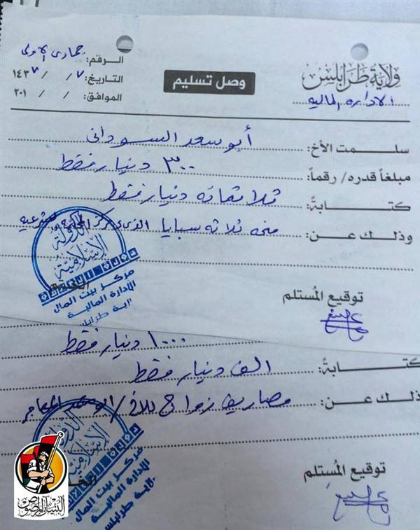 ومن الوثائق الأخرى، وصول مالية لعناصر التنظيم، بمبالغ بعضها كبير جدًا، حيث وقّع “أبو حمزة الكناني”، على استلام مبلغ يعادل 13.5 ألف دولار، كمكافأة عن شهر رجب فقط، وباع “أبو سعد السوداني” ثلاث سبايا بمبلغ لم يتجاوز الـ250 دولارًا، وتسلّم “أبو النور التونسي”، مبلغًا يقرب من الألفي دولار، لمساعدته في تكاليف الزواج.