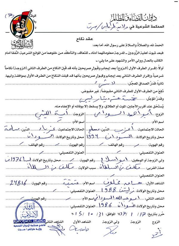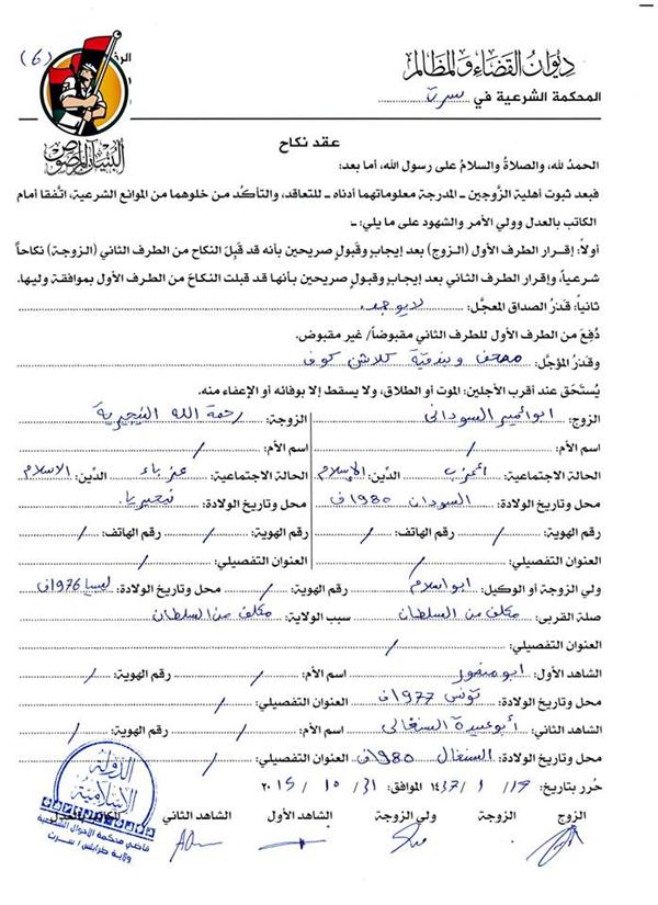 فيما تزوج “أبو أمير السوداني” من “رحمة الله النيجيرية” بلا مقدم عقد، وبمؤخر “مصحف وبندقية كلاشينكوف”، ومن ضمن عقود الزواج، تبين أن عقدًا واحدًا فقط كان فيه ولي الزوجة أحد أقاربها (شقيقها)، في حين أن البقية أشخاص جاء في العقد أنهم تمت توليتهم على الفتاة من قبل “السلطان”.