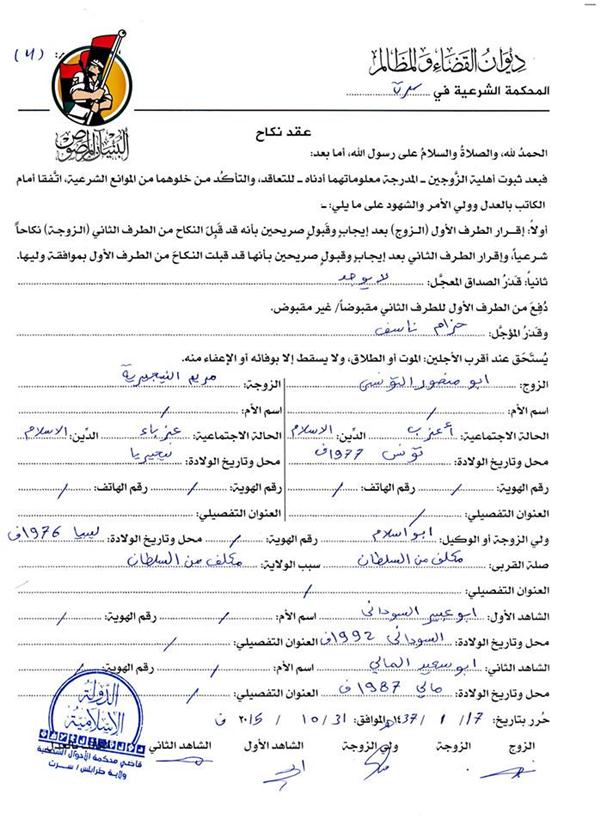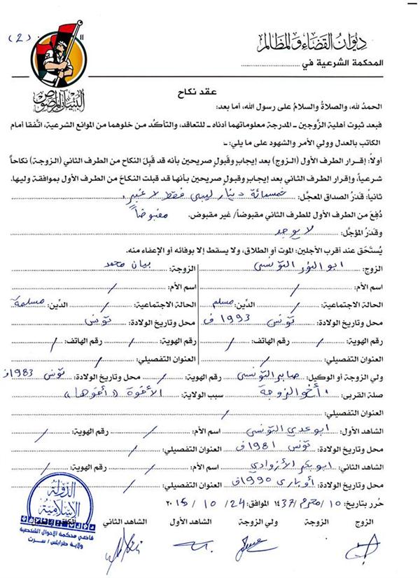 نشر المكتب الإعلامي لعملية “البنيان المرصوص” عددًا من الوثائق التي عثر عليها في أحد مقرات تنظيم الدولة توثّق لحالات زواج تمت بمدينة سرت.