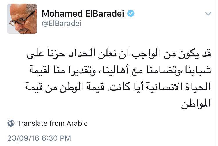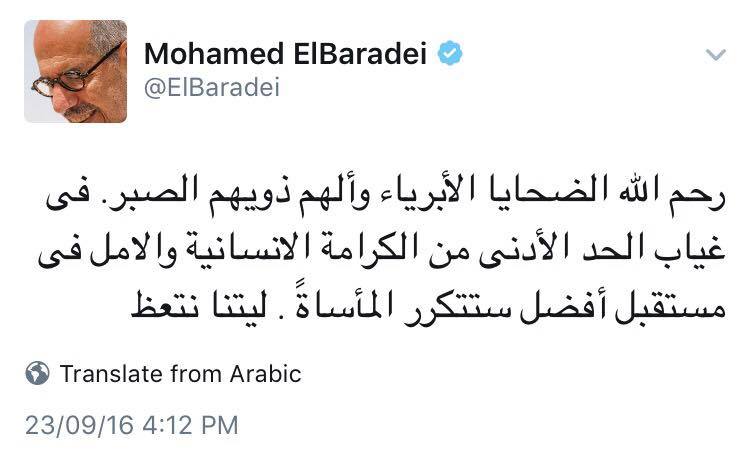 وكتب البرادعي تدوينة على تويتر قال فيها “رحم الله الضحايا الأبرياء وألهم ذويهم الصبر. في غياب الحد الأدنى من الكرامة الإنسانية والأمل في مستقبل أفضل ستتكرر المأساة. ليتنا نتعظ”.