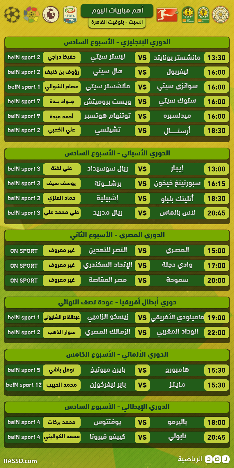 تقام اليوم السبت العديد من المبارات الهامة في البطولات المختلفة ، وتأتي أهمية هذه المباريات بسبب مشاركة عدد من اللاعبين المصريين المحترفين في أوروبا مع فرقهم بالإضافة للقاء العودة لنادي الزمالك أمام الوداد في قبل نهائي دوري ابطال افريقيا.