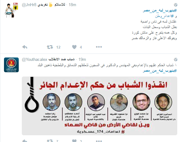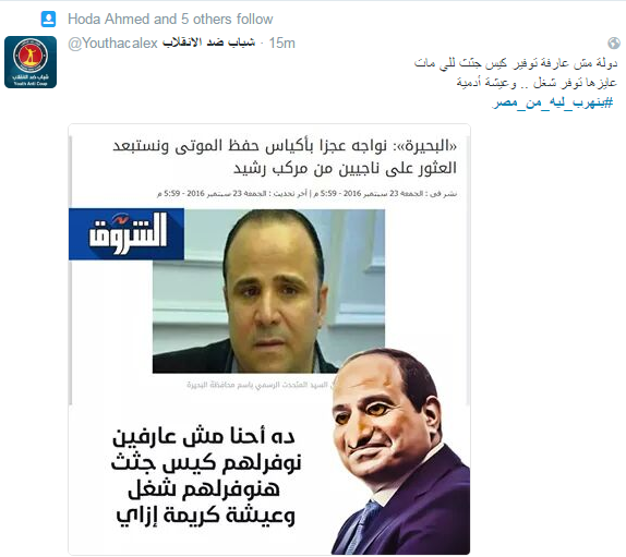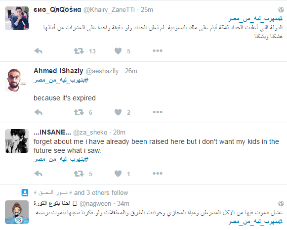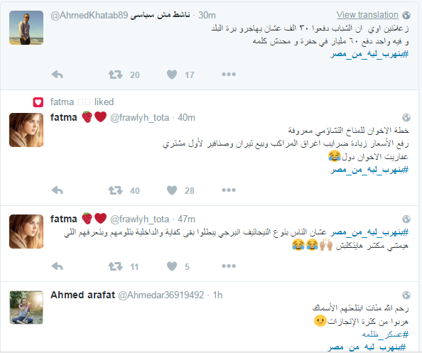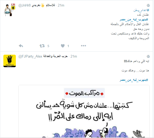 دشن مغردو موقع التدوين العالمي “تويتر” هاشتاج “بتهرب ليه من مصر”، تضامنًا مع ضحايا مركب الهجرة الغير شرعية الغارقة بساحل البحر المتوسط بمركز رشيد في البحيرة بمصر، والتي ارتفع عدد ضحاياها إلى 162 قتيلاً، بعد انتشال قوات حرس الحدود المصرية 100 جثة جديدة، في اليوم الثالث من أعمال البحث عن المفقودين.