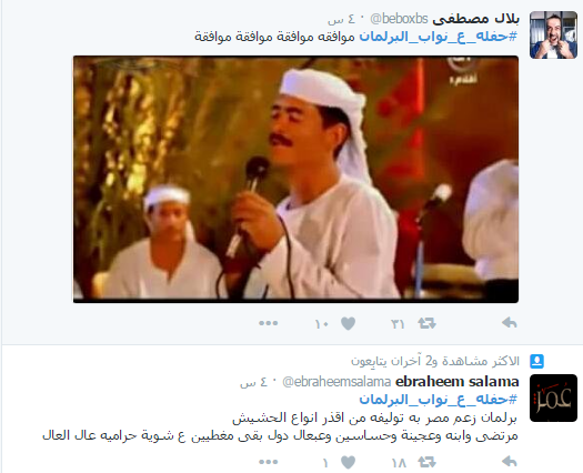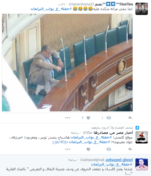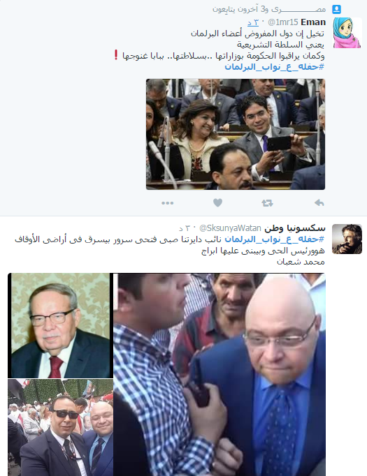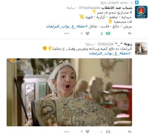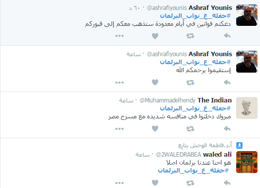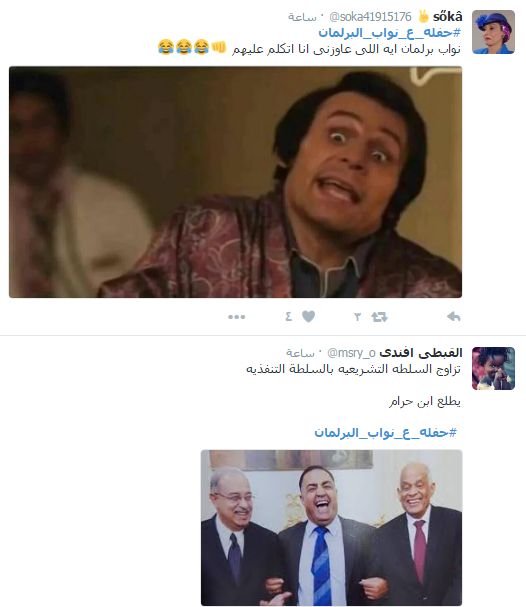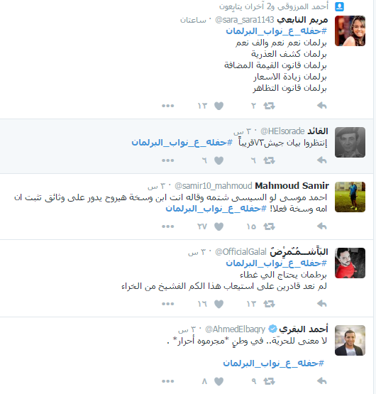 سخر رواد عبر موقع التواصل الاجتماعي “تويتر” من أداء البرلمان المصري، وتصريحات نوابه المثيرة للجدل، ودشن النشطاء على موقع التدوين المصغر”تويتر” هاشتاج تحت اسم “حفله_ع_نواب_البرلمان”، شارك فيه عدد كبير من رواد الموقع الذين سخروا من نواب البرلمان.