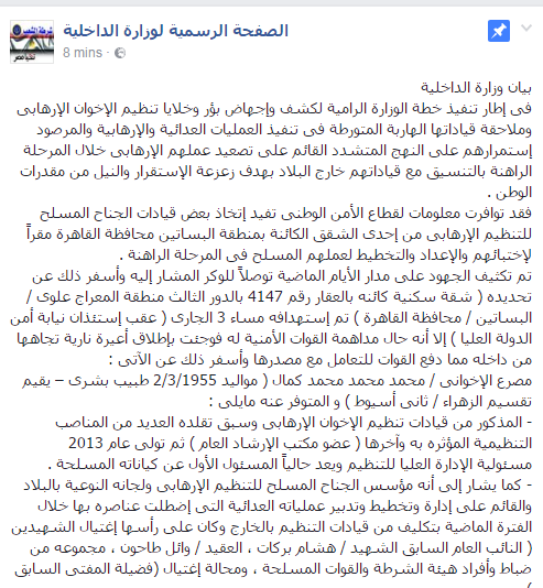 أعلنت وزارة الداخلية في بيان لها عبر “الفيس بوك” مقتل الدكتور محمد كمال عضو مكتب الارشاد بجماعة الإخوان المسلمين، خلال عملية مداهمة بحي البساتين في القاهرة، زاعمة أنها واجهت إطلاق أعيرة نارية من مقر إقامة كمال فواجهتهم بإطلاق النار مباشرة.