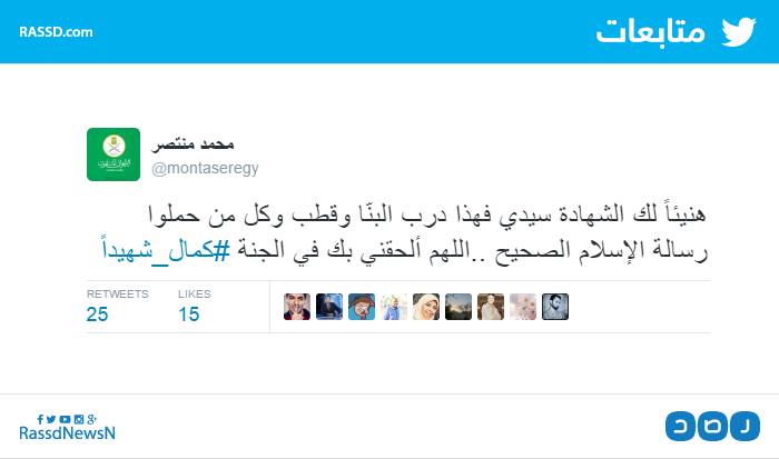 نعى محمد منتصر المتحدث الإعلامي باسم جماعة الإخوان المسلمين عبر موقع “تويتر” الدكتور محمد كمال عضو مكتب الإرشاد، الذي اغتالته الداخلية المصرية مساء أمس عقب اعتقاله بساعات من حي البساتين بالقاهرة.