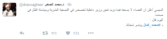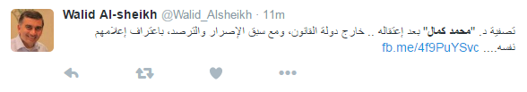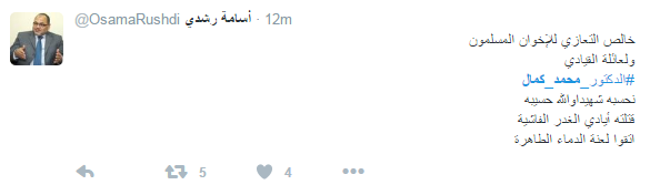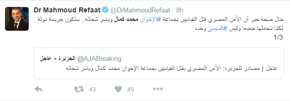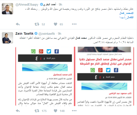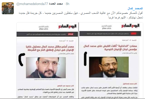 أعلنت وزارة الداخلية، في الساعات الأولى من صباح اليوم تصفية الدكتور محمد كمال، عضو مكتب الإرشاد لجماعة الاخوان المسلمين، وأحد مرافقيه، بعد اعتقالهما بساعات.