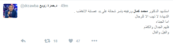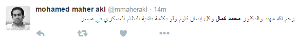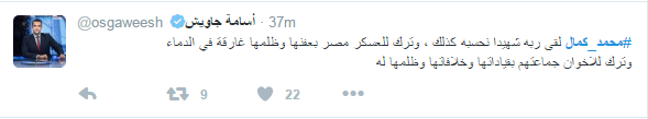 و تفاعل رواد مواقع التواصل مع خبر التصفية، وتم تدشين وسم ” محمد كمال ” وتوالت ردود الأفعال المنددة بحادث الاغتيال ووحشية الداخلية في التعامل مع خصومها، ناعين الدكتور كمال، الذي عاش بطلاً ومات شهيدًا”، علي حد وصفهم .