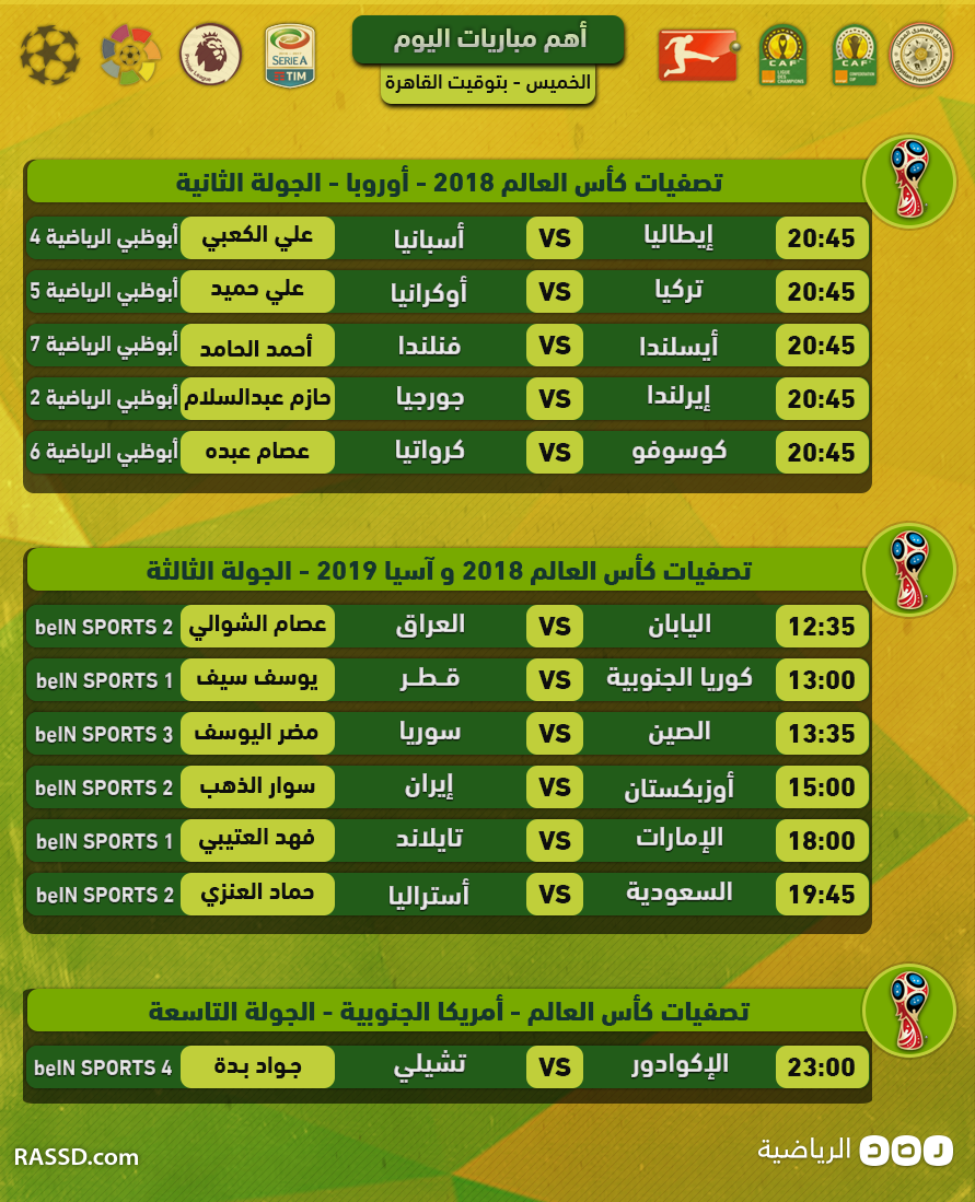 تجرى اليوم الخميس، مباريات مختلفة لمنتخبات العالم، تتركز معظمها على تصفيات كأس العالم 2018م، المقرر إقامته في أوروبا.