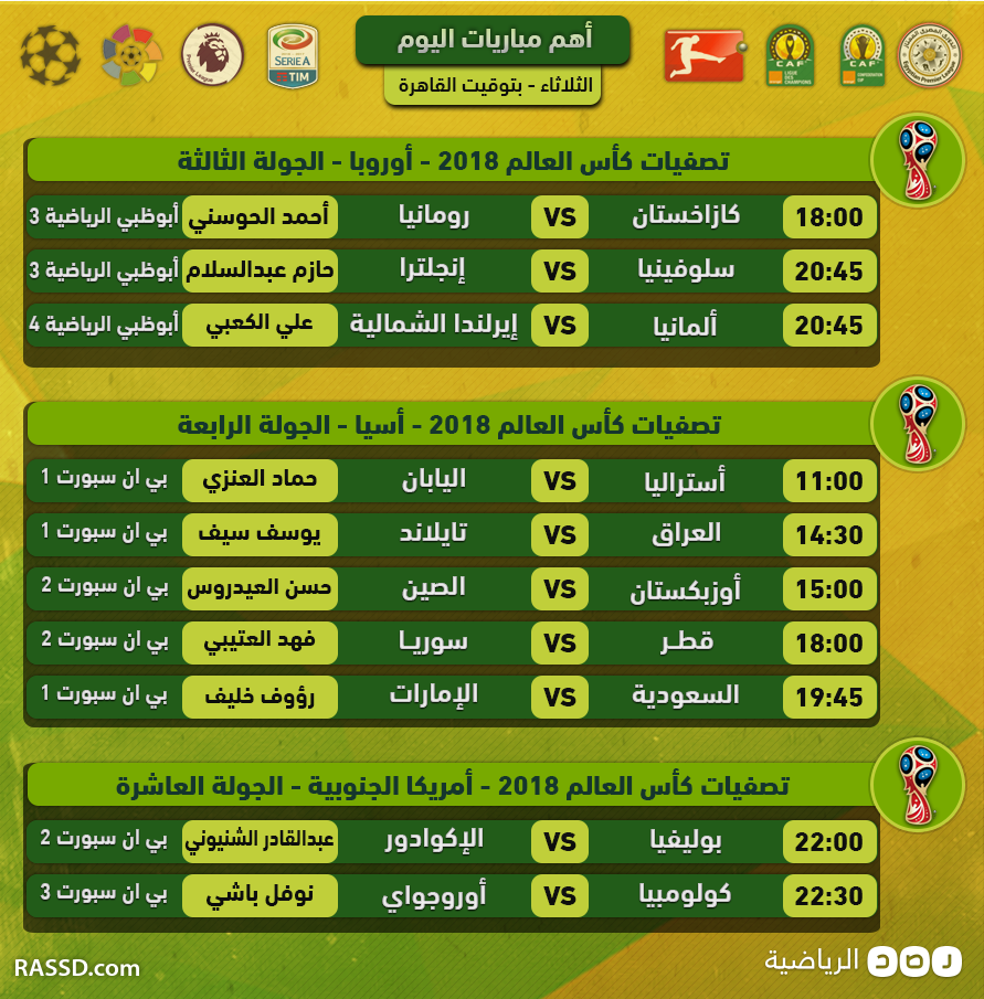 تجرى اليوم الثلاثاء، عدة مباريات في التصفيات المؤهلة لكأس العالم 2018، والتي تشكل طقسًا كرويًا للمنتخبات الوطنية.