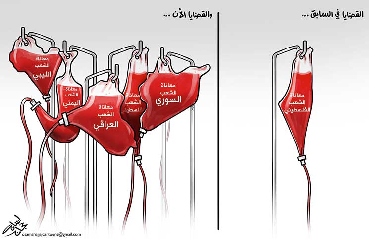 كما قارنت “القدس العربي” في كاريكاتير اليوم، بين القضايا التي كانت تشغل المواطن العربي في السابق وهي القضية الفسطينية فقط، وبين الحاضر وهي كل قضايا الوطن العربي، الفلسطينية، والسورية، والليبية، واليمنية، والعراقية.