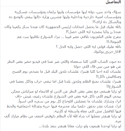 لوحظ في الآونة الأخيرة انتقال التعبير عن ضعف الحكومة وفشل النظام في حل الأزمات الاقتصادية من وسائل التواصل الاجتماعي إلي الشارع المصري ، حيث كانت ساحات الفضاء الالكتروني هي مسرح الانتقاد والتعبير عن شظف العيش من خلال الوسوم المختلفة ؛ بعد اقتصار وسائل الاعلام التقليدية علي مؤيدي النظام و المهللين بانجازاته اليومية .