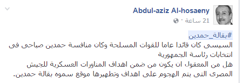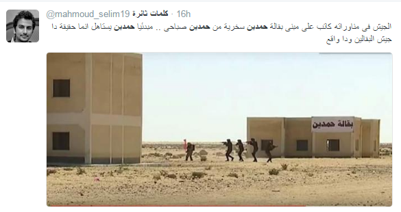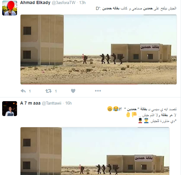و تبانيت ردود الفعل الساخرة من اختيار الجيش لاسم ” حمدين ” بالأخص، معتبرين إياها إهانة ، وتم تدشين وسم “بقالة حمدين” ، وجاءت بعض التعليقات على مواقع التواصل كالتالي :