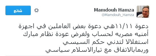 وأكد”حمزة” اليوم الجمعة ، في تغريده له عبر حسابه على موقع التدوين المصغر “تويتر”:  أن دعوة ١١/١١هي دعوة بعض العاملين في اجهزة أمنيه مصريه، على حد  قوله.