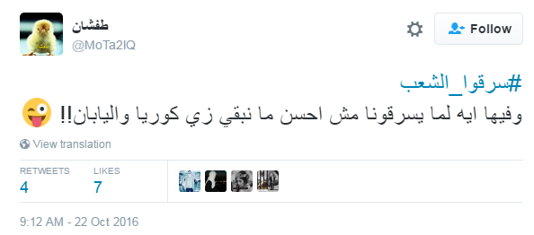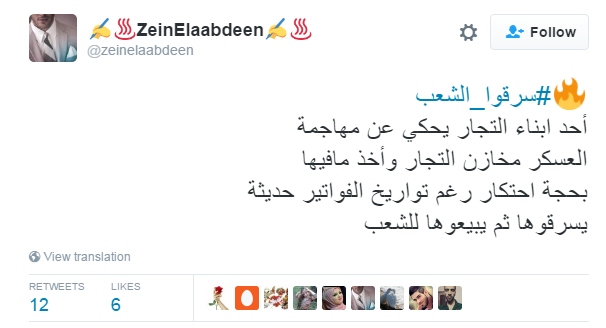دشن مغردو موقع التدوين العالمي "تويتر" هاشتاج "سرقوا الشعب"، أكدوا فيه رفضهم لسياسات النظام الحالي، فيما طالب أخرون بمعرفة ودرسة عناصر الثوة التي يتمتع بها النظام قبل مواجهته في انتفاضة ثورية قادمة