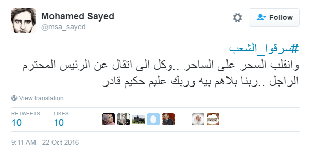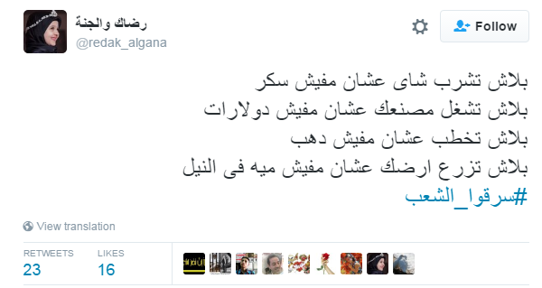 دشن مغردو موقع التدوينات القصيرة “تويتر” هاشتاج “سرقوا الشعب”، مؤكدين فيه على رفضهم لسياسات النظام الحالي، فيما طالب آخرون بمعرفة ودرسة عناصر الثوة التي يتمتع بها النظام قبل مواجهته في انتفاضة ثورية قادمة، في ظل الغلاء وارتفاع الأسعار وسقوط الجنيه المصري أمام العملات.