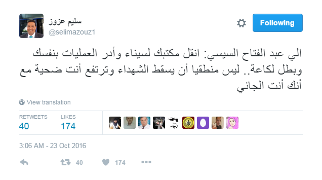 وقال عزوز فى تدوينة له عبر موقع التواصل الاجتماعى “تويتر” :” إلى عبدالفتاح السيسي: إنقل مكتبك لسيناء، وأدر العمليات بنفسك وبطل لكاعة.. ليس منطقيًا أن يسقط الشهداء وترتفع أنت ضحية مع أنك أنت الجاني”.