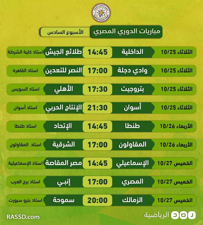 مع بداية الأسبوع السادس من الدوري المصري، نعرض لمتابعينا الأعزاء جدولًا بمواعيد تلك المباريات.