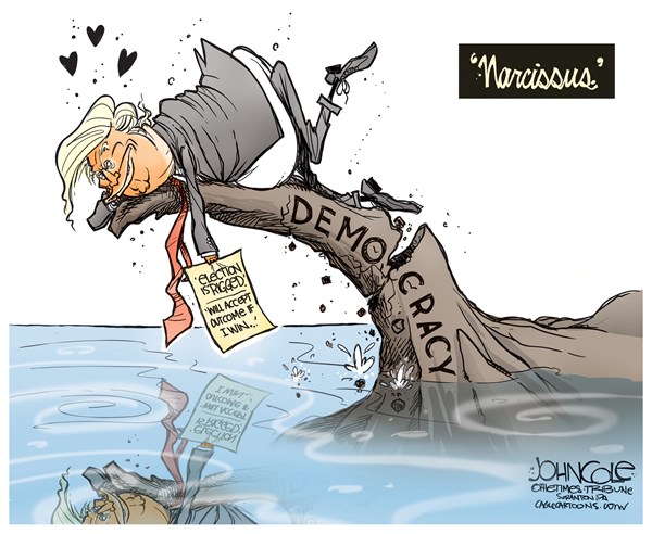– عبر موقع “كاجل” للرسوم الساخرة، عن انتهاك ترامب للديموقراطية، بسبب تصريحاته بخصوص عدم اعترافه بالانتخابات والنتيجة حال سقوطه فيها.