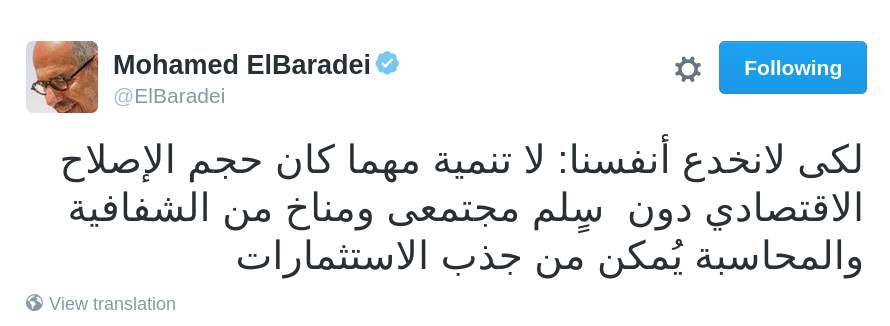 أكد الدكتور محمد البرادعي – مدير وكالة الطاقة الذرية الأسبق – أن تحقيق التنمية مرهون بتواجد مناخ من الشفافية يمكّن الدولة من جذب الاستثمارات.