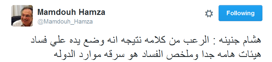 وقال في تغريدة عبر حسابه بموقع التدوين المصغر “تويتر”: “هشام جنينة، الرعب من كلامه نتيجة أنه وضع يده على فساد هيئات هامة جدًا، وملخص الفساد هو سرقة موارد الدولة”.
