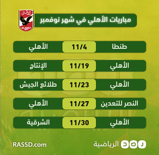 ويقدم موقع “رصد” لمتابعيه الأعزاء جدول مباريات الأهلي والزمالك طوال شهر نوفمبر، في الدوري المصري.