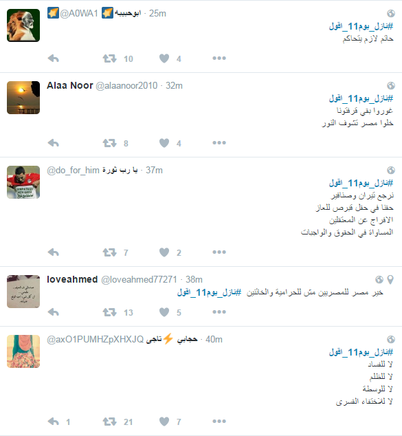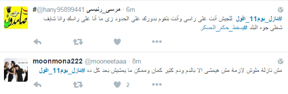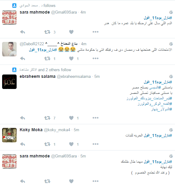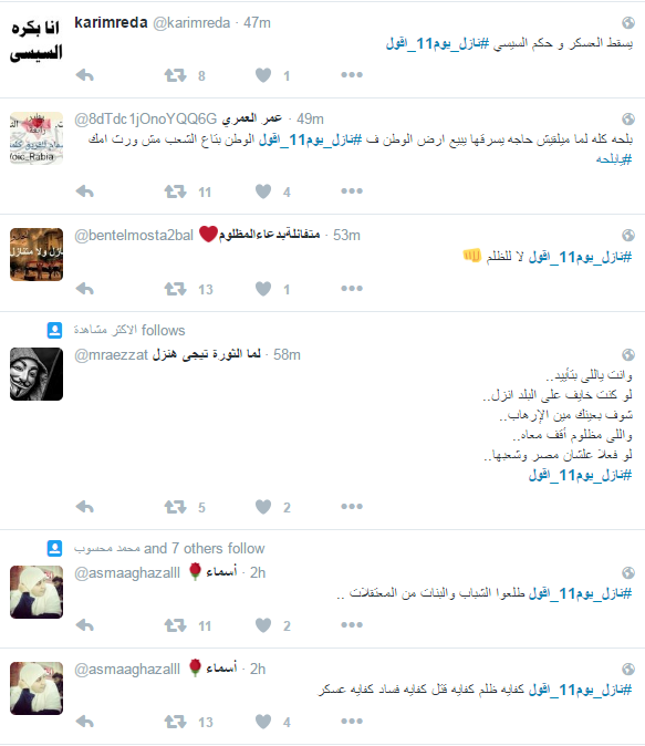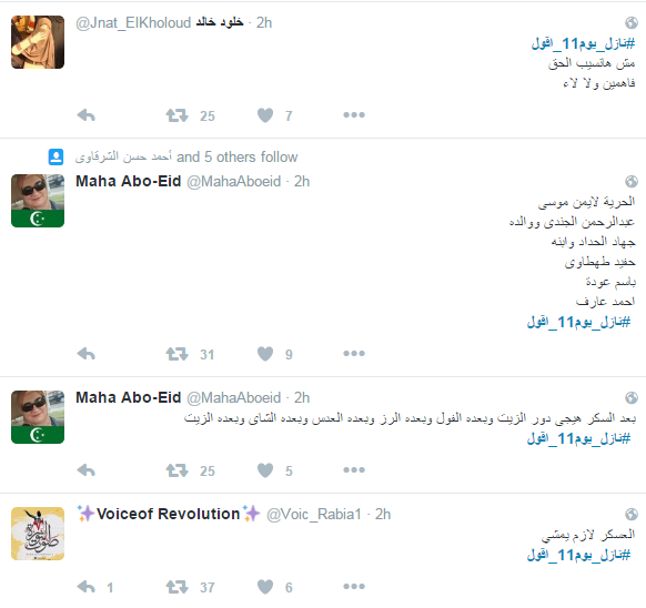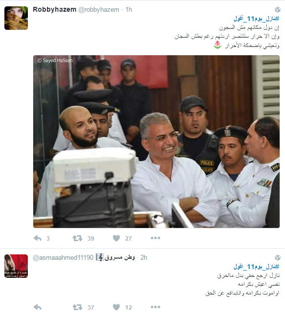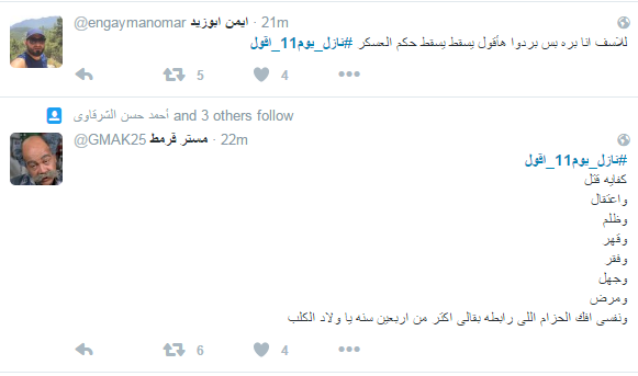 دشن نشطاء موقع التواصل الاجتماعي “تويتر” هاشتاج تحت وسم “#نازل_يوم11_أقول”، وسط دعوات يوم 11 نوفمبر، ومطالبات بالعيش والحرية والكرامة والإفراج عن المعتقلين السياسين، ومطالبات برحيل حكم العسكر والسيسي، واستياء بعض النشطاء من غلاء الأسعار واختفاء بعض السلع الغذائية الأساسية.