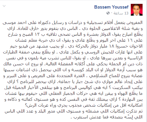 وقال يوسف في تدوينة على صفحته بموقع التواصل الاجتماعي، فيسبوك: “المفروض يتعمل أفلام تسجيلية و دراسات و رسايل دكتوراه على احمد موسى و بقية شلة الاعلاميين الحلوة دي.. الناس دي بتقوم بدور خارق للعادة.. ازاي يطّلع امبارح يقول الدولار بعشرة و الناس تصحى تلاقيه بـ13 الصبح و شارخ على 16 على اخر اليوم.”