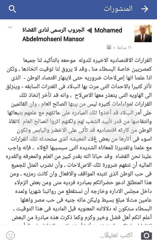 حصلت شبكة “رصد”، على تسريب من داخل صفحة خاصة للقضاة على موقع التواصل الاجتماعي “فيس بوك”، تحمل اسم “الجروب الرسمي لنادي القضاة”، نشر فيها المستشار محمد عبد المحسن منصور نائب رئيس محكمة النقض، منشور أعرب فيه عن عدم رضاه التام للقرارت الاقتصادية التي اتخذها السيسي وحكومة شريف إسماعيل، معتبرًا أن تلك القرارات تزيد من معاناة البسطاء.