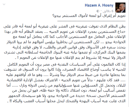 وتابع حسني: “إذا كان القائمون على أمر السياسات النقدية فى مصر يرون أن التعويم الكامل للجنيه لا يناسب أوضاع الاقتصاد المصرى، وإذا كانوا يرون أن السوق قد تشوهت بما يجعلها عاجزة عن ضبط سعر الدولار بيعاً وشراءً، وهو ما قد أوافقهم عليه، فقد كان عليهم – بدلاً من تعويم الجنيه – الاعتراف بفشل الإدارة الاقتصادية للبلاد، وتحمل كل المسؤولين عنها مسؤولياتهم من رئيس الدولة ونازل”.