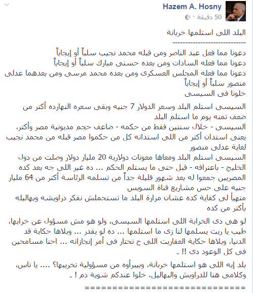 وتابع:”السيسى – خلال سنتين فقط من حكمه – ضاعف حجم مديونية مصر وأكتر، يعنى استدان أكتر من اللى استدانه كل من حكموا مصر قبله من محمد نجيب لغاية عدلي منصور.. السيسى استلم البلد ومعاها معونات دولارية 20 مليار دولار وصلت من دول الخليج – باعترافه – قبل حتى ما يستلم الحكم.. ده غير اللى جه بعد كده، المصريين جمعوا له بعد شهور قليلة جدًا من تسلمه الرئاسة أكتر من 64 مليار جنيه على حس مشاريع قناة السويس.. متهيأ لى كفاية كده عشان مرارة البلد ما تستحملش.. نفكر دراويشه وبهاليله بأكتر من كده”.