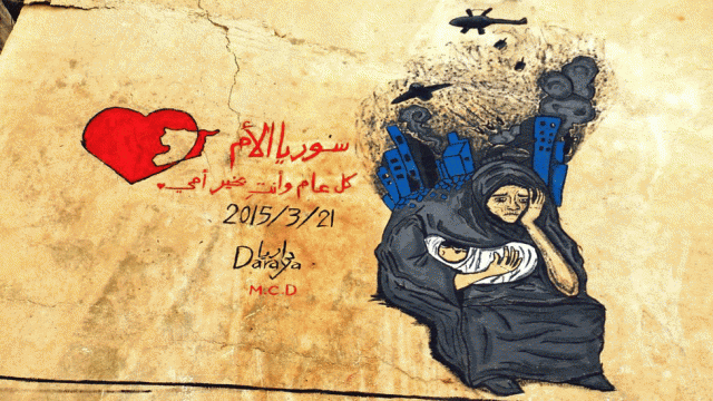 يجوب الشامي شوارع داريا، فيرسم على حوائطها وأنقاضها، رسومًا تحمل بين طياتها آلام السوريين، وأملهم العودة إلى الوطن.