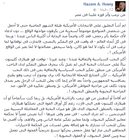 واختتم حسني:”انتخاب ترمب، وما سيترتب عليه من تداعيات ستؤثر علينا حتماً عند تشكيل مسارات المستقبل، هو فرصة للمصريين لإعادة التفكير فى ثوابت كثيرة ظلت تتحكم فى العقل المصرى ومزاجية المصريين – بكل فئاتهم – لزمن طال بأكثر مما تتحمله حركة التاريخ “.