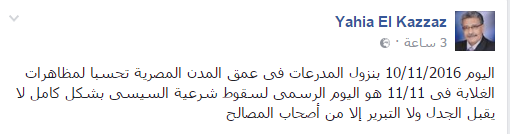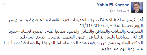 وتابع من خلال عدة تحليلات متتابعة:” أمر رئيس سلطة الاحتلال بنزول المدرعات في القاهرة والمنصورة والسويس اليوم تحسبا لمظاهرات 11/11/2016، المدرعات والدبابات والمدافع والقنابل والجنود مكانها على الحدود لحماية حدود الدولة وسيادتها وليس نزولها فى عمق الشعب لتخوبف وترويع المواطنين.