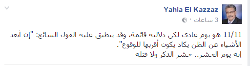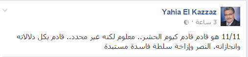 مضيفا:”11/11 هو قادم قادم كيوم الحشر.. معلوم لكنه غير محدد.. قادم بكل دلالاته وإنجازاته. النصر وإزاخة سلطة فاسدة مستبدة”