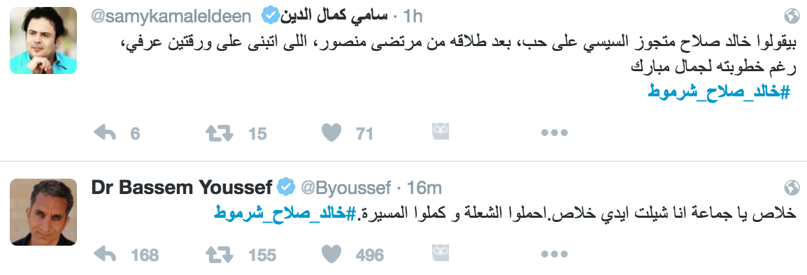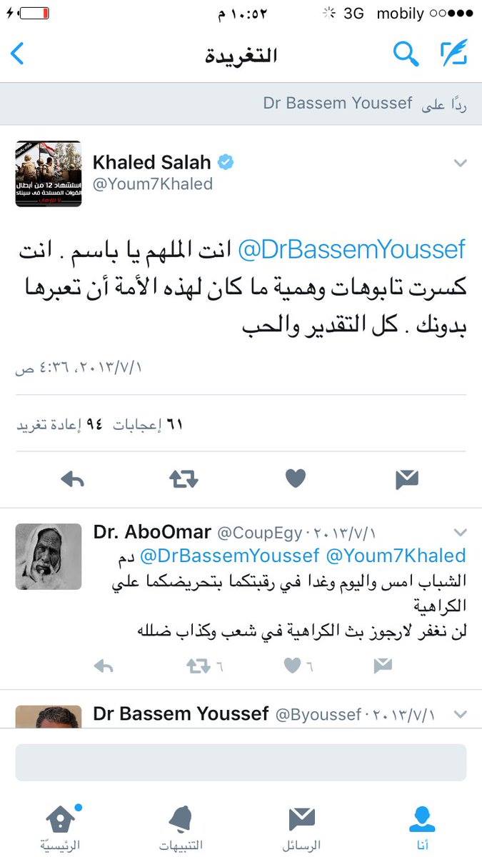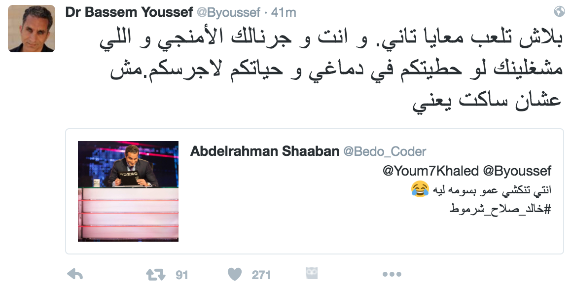ورد خالد صلاح بدوره على باسم يوسف في تغريدتين جاءتا كالتالي: