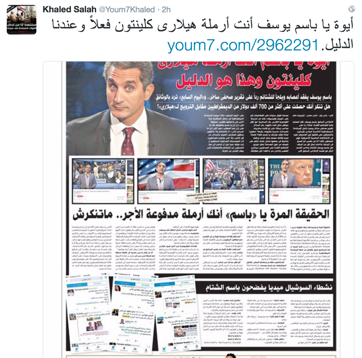 كما تداول نشطاء رد خالد صلاح في وقت سابق على باسم يوسف واصفًا إياه بأنه ملهم، لكن الخلاف الذي اشتد الآن جعل من باسم يوسف عميلًا لكلنتون على حد وصف جريدة اليوم السابع وخالد صلاح.