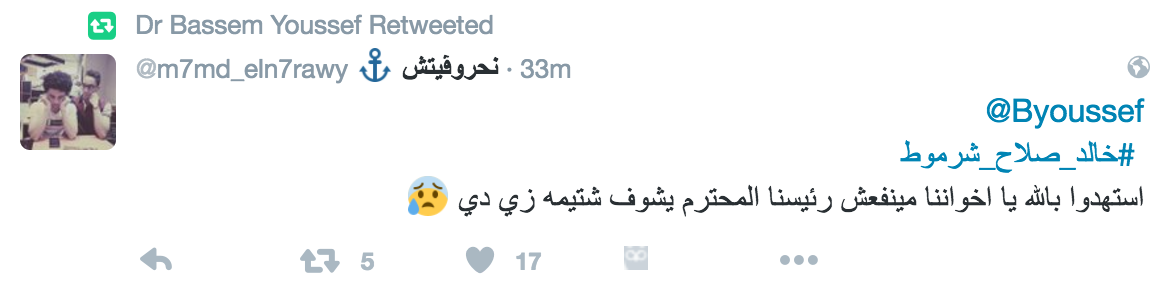 وأبرز المتفاعلين على الهاشتاج الإعلامي الساخر باسم يوسف، والذي كان من أوائل من أعلنوا استيائهم من خالد صلاح بالأمس، بعدما نشرت جريدة اليوم السابع تقريرًا عنونت فيه: ” باسم يوسف، ووائل غنيم، وتوكل كرمان، ومصطفى النجار، وجمال عيد يحولون تويتر لحائط مبكى بعد فوز ترامب”.