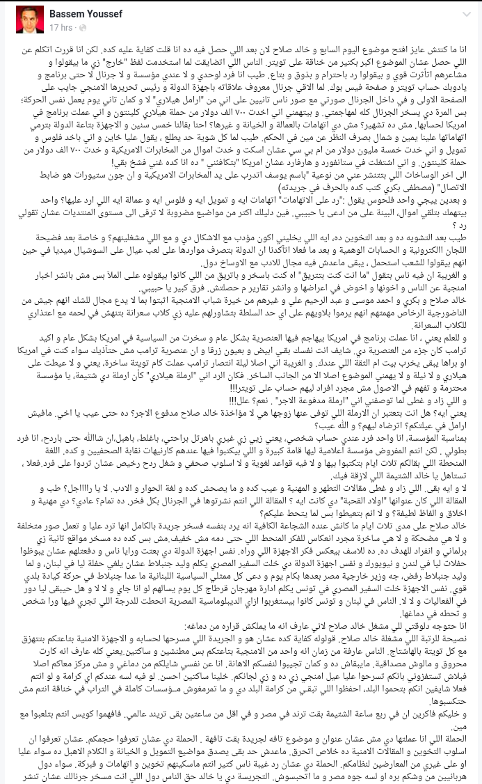 نشر باسم يوسف تدوينة على صفحته بفيسبوك قال فيها: “طيب انا فرد لوحدي ولا عندي مؤسسة ولا جرنال لا حتى برنامج و يادوبك حساب تويتر و صفحة فيس بوك. لما الاقي جرنال معروف علاقاته بأجهزة الدولة و رئيس تحريرها الامنجي جايب على الصفحة الاولى و في داخل الجرنال صورتي مع صور ناس تانيين على اني من ’ارامل هيلاري‘ لا وكمان تاني يوم يعمل نفس الحركة؛ بس المرة دي يسخر الجرنال كله لمهاجمتي. وبيتهمني اني اخدت 700 الف دولار من حملة هيلاري كلينتون واني عملت برنامج في امريكا لحسابها. مش ده تشهير؟ مش دي اتهامات بالعمالة والخيانة وغيرها؟”.