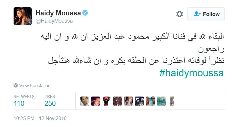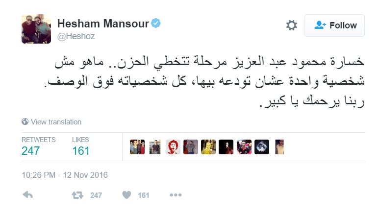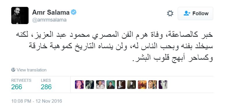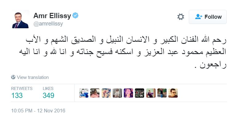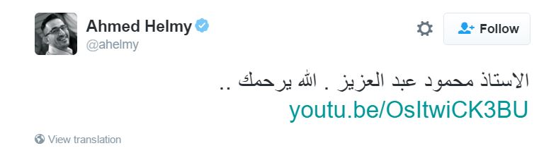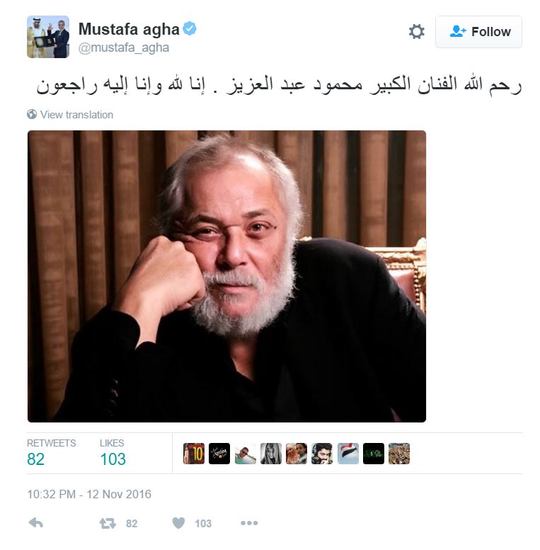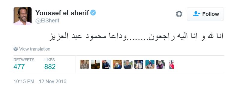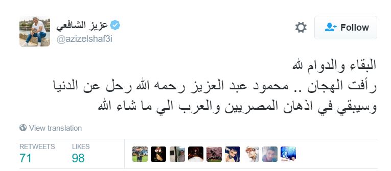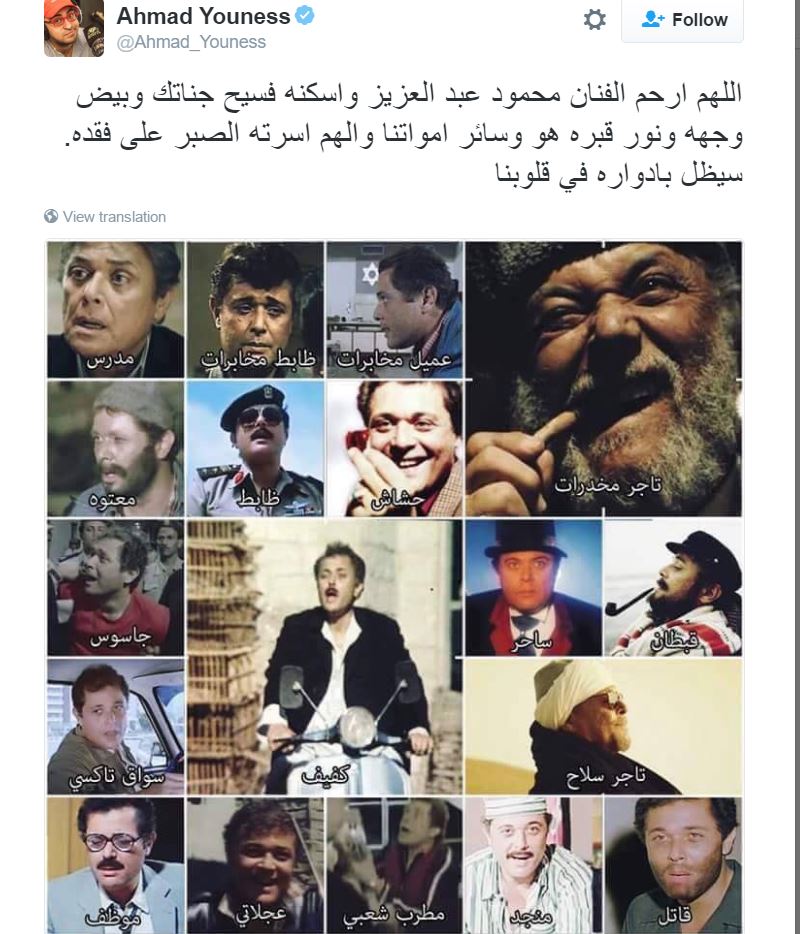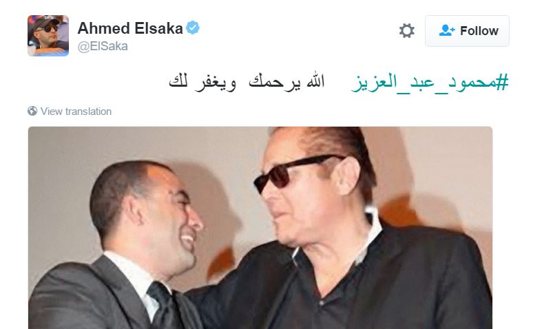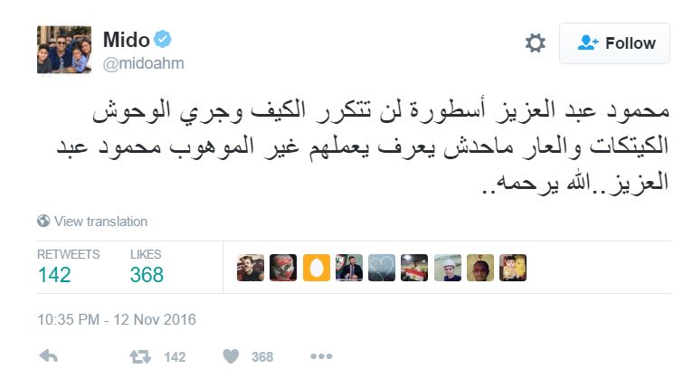 وقال اللاعب محمد أبو تريكة “رحم الله الفنان محمود عبد العزيز، وغفر الله له ذنبه واسكنه فسيح جناته، قابلته مرة واحدة فدخل قلبي من يومها.