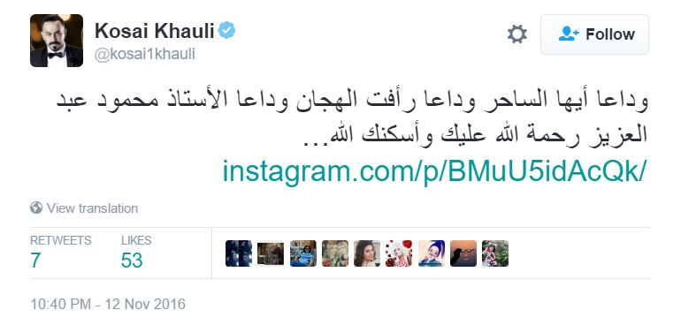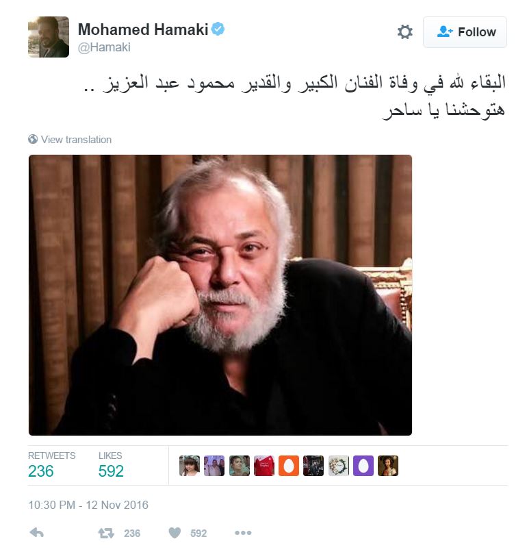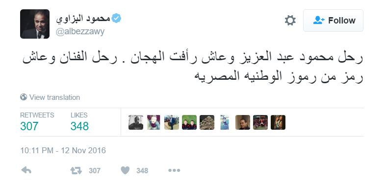 وشارك مشاهير الفن والرياضة، في “الهاشتاج” مسترجعين قائمة طويلة من أعمال الراحل، وقال الفنان محمد هنيدي على صفحته على “تويتر”: “البقاء لله في الفنان الرائع والمبدع محمود عبد العزيز وداعًا يا ساحر”.