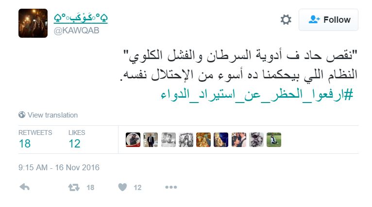 وتصدر الوسم، القائمة الأعلى مشاركة في موقع التدوينات الصغير “تويتر”، بعد استجابة عدد كبير من المستخدمين لتفعيله، مطالبين بوقف الحظر وتوفير الأدوية اللازمة للمرضى.