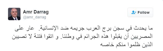 وقال دراج عبر تدوينه نشرها علي موقع “تويتر”: “ما يحدث في سجن برج العرب جريمه ضد الإنسانية. عار علی المصريين أن يقبلوا هذه الجرائم في وطننا. و اتقوا فتنة لا تصيبن الذين ظلموا منكم خاصه”.
