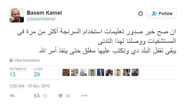 وقال كامل في تغريدة عبر حسابه بموقع التدوين العالمي “تويتر”: “إن صح خبر صدور تعليمات استخدام السرنجة أكثر من مرة في المستشفيات ووصلنا لهذا التدني، يبقى نقفل البلد دي ونكتب عليها مغلق حتى ينفذ أمر الله”.