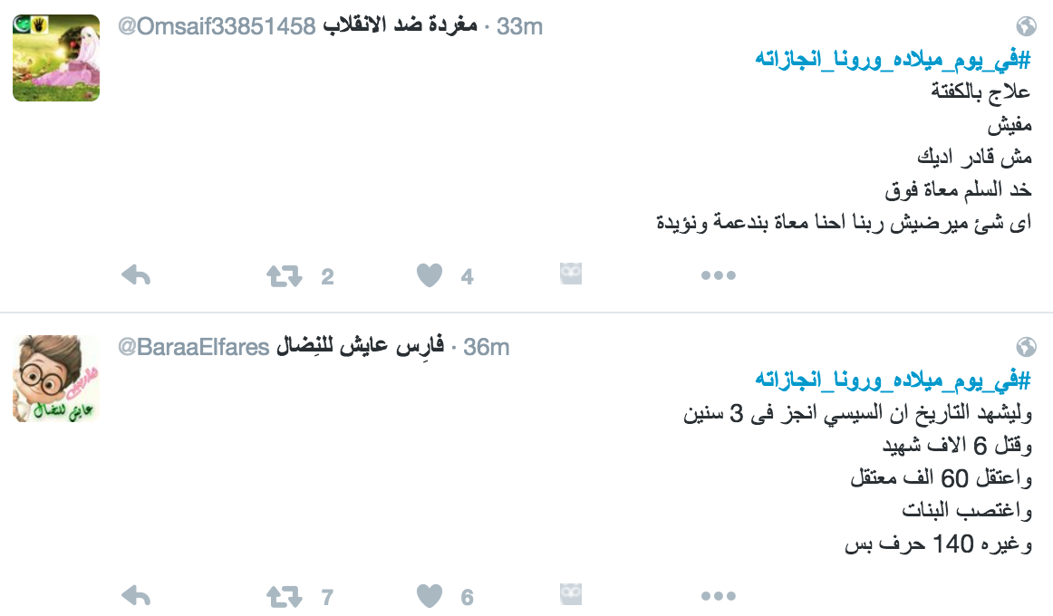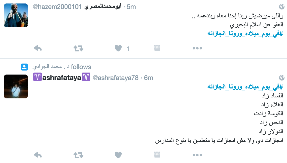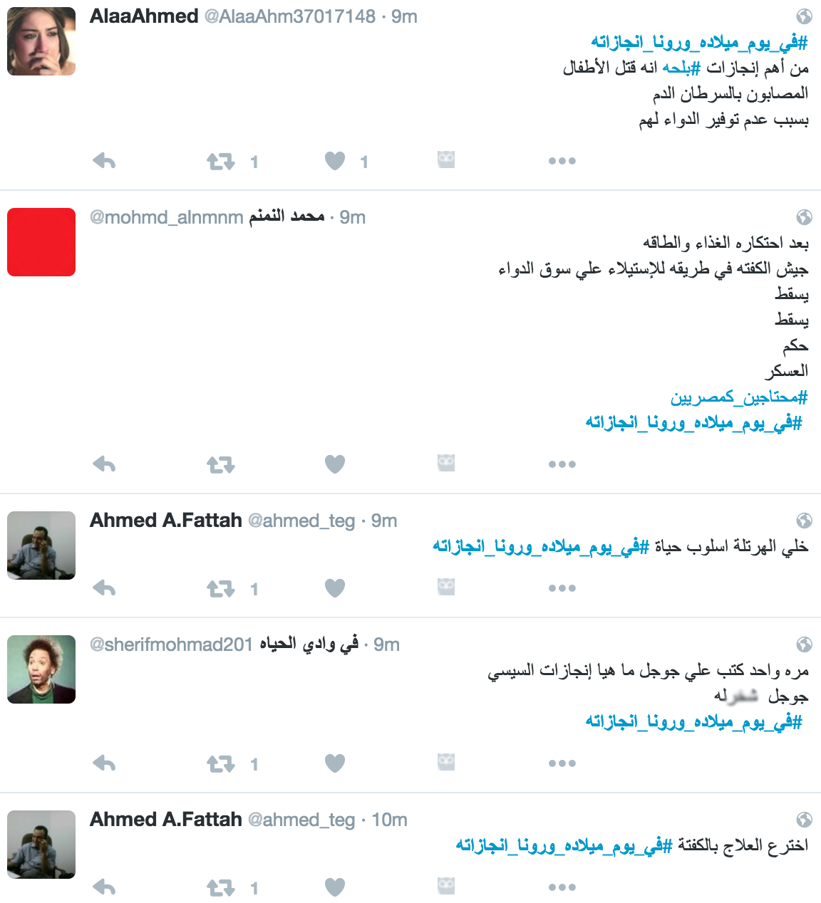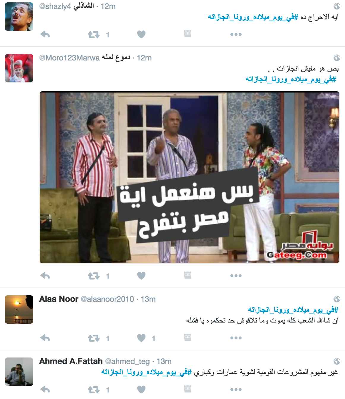 ودار الحديث بين النشطاء حول إنجازات عبدالفتاح السيسي منذ توليه الرئاسة بعد الانقلاب العسكري، في محاولة لوضع تلك الإنجازات عبر الهاشتاج، وكانت أغلب تلك المشاركات سلبية، وتناولت ما قدمه السيسي من تصريحات وأعمال في البلاد.