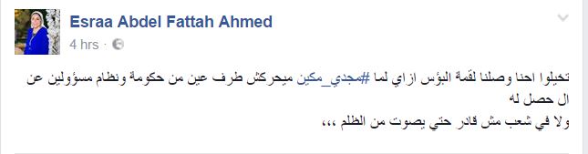 واستنكرت الناشطة إسرا ء عبد الفتاح، عبر صفحتها الشخصية على موقع فيس بوك، عدم وجود رد فعل من الحكومة ومن الشعب، قائلة “تخيلوا احنا وصلنا لقمة البؤس ازاي لما #مجدي_مكين ميحركش طرف عين من حكومة ونظام مسؤولين عن ال حصل له، ولا في شعب مش قادر حتي يصوت من الظلم “.
