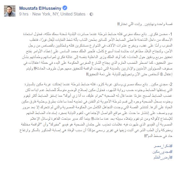 فيما قارن مصطفى الحسيني، بين واقعة بائع السمك المغربي، والتي خرج الآلاف على اثرها في الشوارع منددين بمقتله، مما اضطر الملك لفتح تحقيق سريع في الحادث، لتبدأ بعدها حملة اعتقالات في صفوف المسؤولين والإداريين، للتحقيق معهم، وبين واقعة قتل المواطن المصري مجدي مكين، والذي لم يحرك أحداً ساكناً.