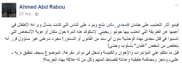 وعقب الدكتور أحمد عبد ربه، أستاذ العلوم الساسية بجامعة القاهرة والجامعة الأمريكية، عن الحادث قائلاً ” لاشكوك هذه المرة حول مكان آو هوية الآشخاص اللى اتسببوا في قتل مجدى بهذه الوحشية بدون آي سند من القانون آو الدستور”