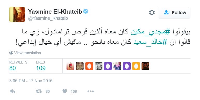 واستنكرت ياسمين الخطيب، الاتهامات التي وجهت للمواطن مكين، بأنه كان بحوزته أقراص ترامادول، مستعيدة قصة “خالد سعيد” واتهامه بحوزته بانجو.